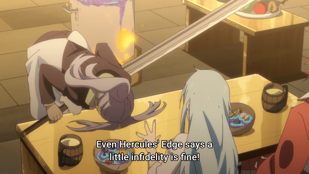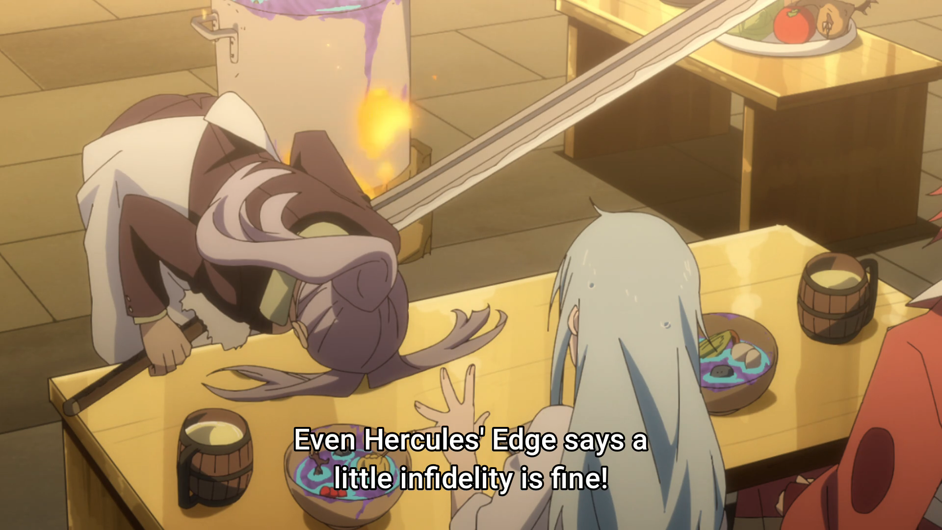 Now then, it’s time for a toast. We did finish a pretty harrowing arc right before the end of the first cour, after all. With everyone being safe and alive again, it does feel nice to be back here. I’m not a huge fan of characters dying only to be revived again. Here’s a little spoiler for my own stories that I’m writing, I will only use this very, very sparsely, and generally in such a way that there’s either a heavy cost involved, or strong hints ahead of time. I digress. I think the way Tensura handled reviving people was fine. Rimuru quite literally and metaphorically had to sacrifice his humanity. Slimanity? Sliminess? You know what I mean right? He killed an entire army of humans on his own to ascend to something greater. I hope there are big repercussions for doing so, and it’s not just a powerboost. If it is a powerboost, he’s going to need it to survive Shion’s cooking. I can’t believe she got a master chef skill. Gordon Ramsay is shedding a tear of pride right now.