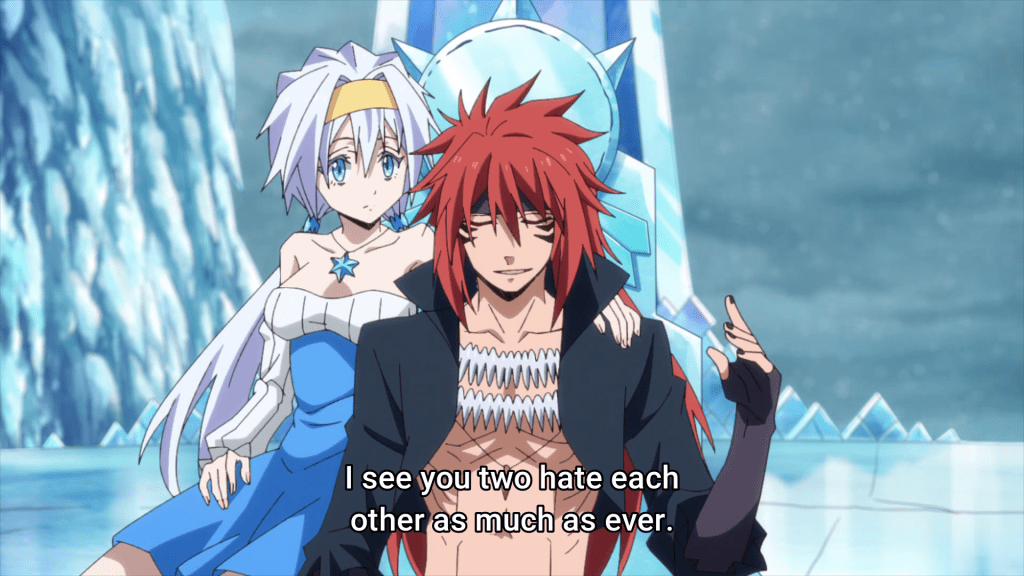 Now here’s a familiar face. I don’t believe we’ve seen Leon Cromwell in action since Season 1. He’s visiting an ice themed demon lord, who we quickly learn is called Guy Crimson, the lord of darkness. He is a big shot, one of the strongest demon lords alongside Milim. He has a whole host of weird looking underlings, and he seems to be demon-themed. That’s honestly a better theme than clowns or harpies, so he’s got that going for him. Vampires have also gotten a bad rep, so he might be the coolest one out there right now. He’s also the guy with red hair that’s been hinted at in the opening. Both Leon and Guy don’t seem like particularly bad people to be honest. And Guy seems to think the same about Leon because he’s definitely interested. Unfortunately for him, Leon does not reciprocate.