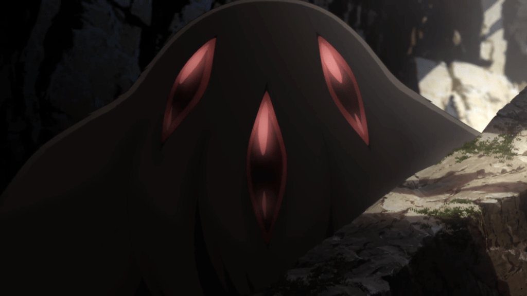 From here on out it’s really a mystery what they can find. It is interesting to hear them talk about creatures who can move in all dimensions unbothered by the curse. That immediately gives me the hope that there is a way to negate the curse and freely travel the abyss. It’s probably how Riko’s mom brought her to the surface. The gang finds some strange creatures and their eggs before being barraged by a firestorm of poisonous fire. Riko’s enthusiasm is still endless as they prepare and eat the aforementioned eggs. Riko gets nostalgic about her home and the friends she left behind and they decide to write them a letter. I don’t think the letter is making it all the way up though. The scene ends with a quick look at a character I’m very excited to see more of, spying on the gang.