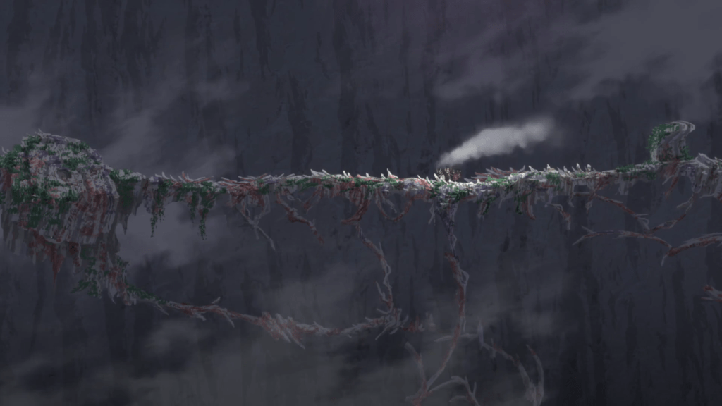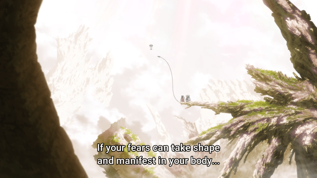 The gang wakes up to some serious creepy problems. Someone managed to retrieve their failed mail balloon, circumvent their protection and leave a threatening letter as well as steal Prushka which was on Riko’s person. Things go from zero to a hundred very fast. They go on the pursuit. Not only that, this person apparently took some of Riko and Nanachi’s hair and then sewed it into the corpse of an animal. We’re reminded that the Abyss doesn’t mess around and isn’t a fun place for a jolly adventure once more. It’s the quieter moments where I’m already starting to notice how much the OST is adding. It’s already so good and so memorable. Just listening to it improves the atmosphere. Across a bridge they see the same symbol that was on the threatening message, so they decide to head there as the music and the sound effects get more ominous. With that in mind they cross the hauntingly beautiful bridge as their adversary watches them from afar.