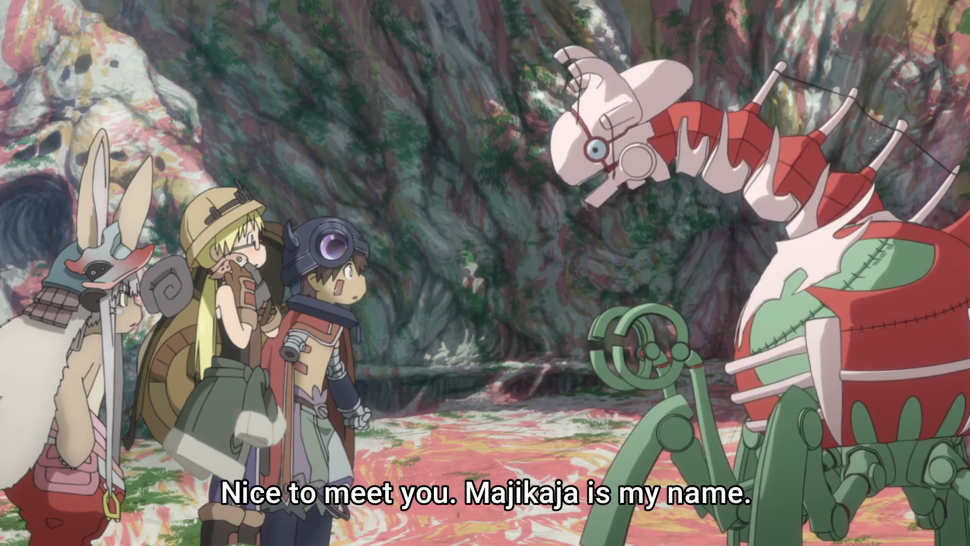 After crossing the bridge and pushing past a barrier we find ourselves at the capital of the unreturned, the golden city, the village of hollows. Strap in folks because things are about to get weird. We meet Majikaja who speaks a combination of broken Japanese and a language completely foreign. They’re in a village surrounded by strange creatures. This episode seems to cover the introductory part of this arc, until about halfway through chapter 40 in early volume 6. We’ve had no more jumps around in the content like last time, but I do still think it’ll be a boon to watchers to have already met Belaf, Wazukyan and Vueko ahead of the rest of the arc. It also makes it so that the opening theme animations make sense. All in all there’s not much I have to add to this episode’s discussion. It’s faithful to the manga, hauntingly beautiful in a way that the manga can’t be without color and sound and makes me very excited to see more of the capital of the unreturned. But for that, we need to come back here next week and do this all over again. Thanks for reading!