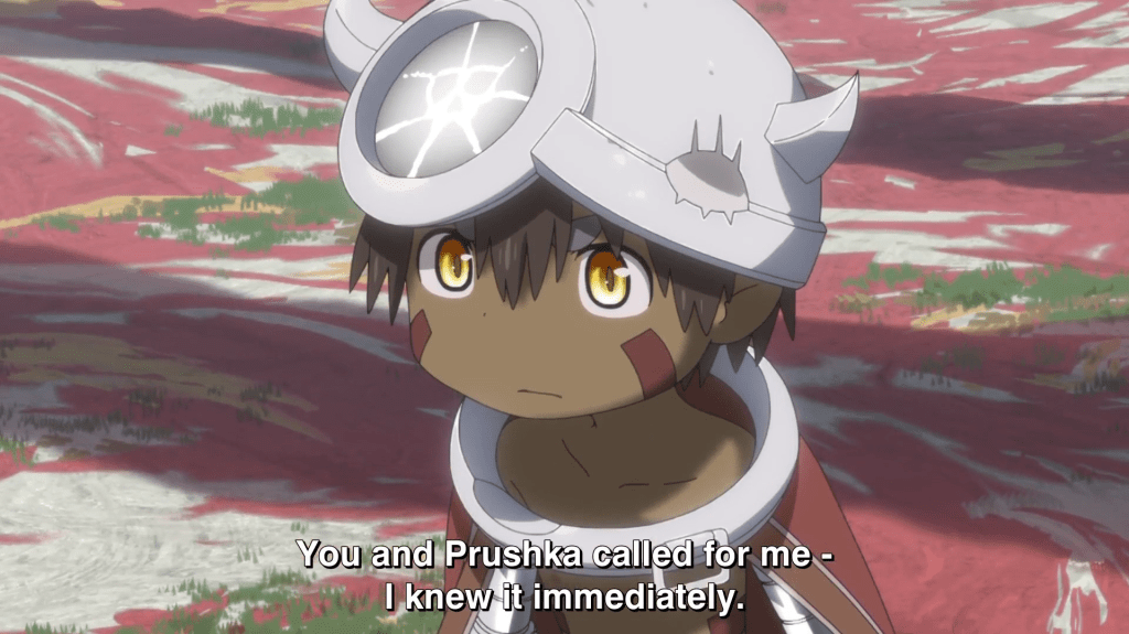 Blowing the whistle has summoned Reg, who looks at least a little bit different now. He’s more powerful and Riko recalls Bondrewd explaining that white whistles allow her to drag out the true power of relics. Now that everything has been resolved and we’re safe again, Wazukyan shows up to explain how the creature works. Basically everything’s been resolved and Reg’s armor goes back to its normal colors. Wazukyan argues that the suffering and horror the villagers experienced is better than boredom and then leaves again. He does leave with Riko the idea that any part of Faputa would be enough value to get Nanachi back. That’ll go great. Reg goes back to Faputa and Riko asks Vueko about Faputa. Moogie and Kaja both say they don’t know who Vueko is. Vueko then reveals to our protagonists that she’s one of the survivors of the suicide squad Ganja, who came here looking for the city of the golden sun. In the manga, we had no idea what this meant at the time, but in the anime we’ve already had a little bit of the three sages’ backstory. Vueko talks about Irumyuui. I had no idea what this referred to in the manga because I thought it was just another word in their strange language. I definitely find that watching this show again in anime form makes a lot of things less confusing. It’s still a really weird story, but I actually feel like I’m properly understanding the flow of the narrative right now. Let me know if you guys feel like it’s easy to follow or not. I’m curious if front loading part of the three sages arc improved the story as much as I think it has. I’m going to go sit outside and read some manga now, thanks for reading!
