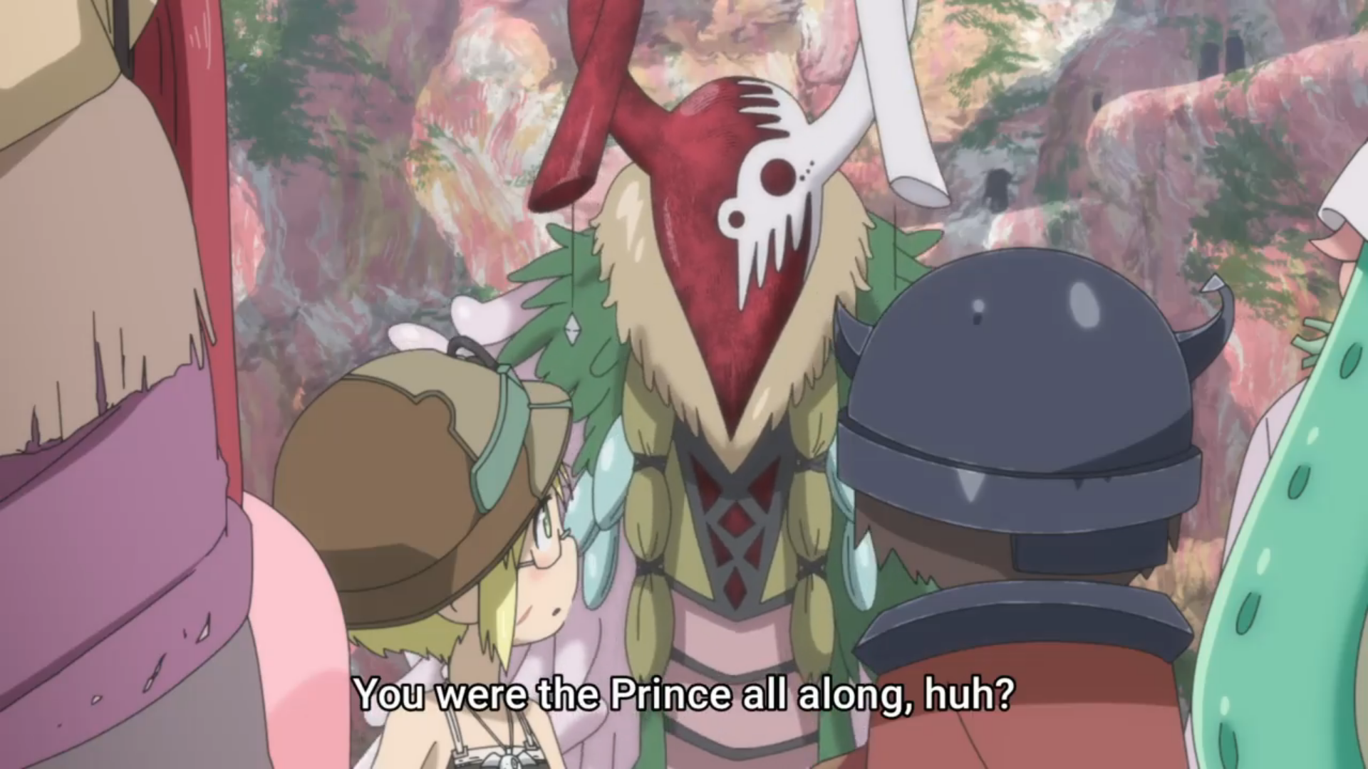 Reg is holding Faputa’s detached arm like it’s about to be a snack for Luffy, the bone sticking out and everything. Faputa is now living rent free in, I mean on top of his head. We’ve learned so far that Faputa never had a parental figure and was born with a hatred for everything around her. Somehow she seems to have become friendly with Reg at some point in the past although Reg doesn’t recall it. Faputa notices Riko’s whistle and comments on how nice Prushka looks now. We jump into the opening theme.