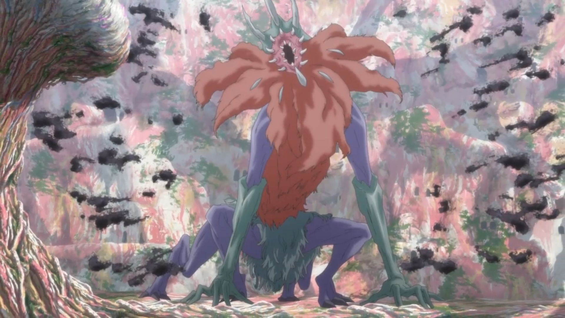 Juroimoh, the beast, is back and they’re after the piece of Faputa that Reg holds. Wazukyan doesn’t like Vueko sharing this information and nabs her. I do love that Wazukyan says Vueko is quick to give in to despair, as if the situation they’ve gone through isn’t something unthinkably insane and she’s just being a drama queen. Vueko’s life has been more horrific than any of us can imagine and Wazukyan seems to have no respect for that. Vueko uses the opportunity to ask why Juroimoh is named after the guy who mistreated her. I don’t think it was revealed to us in the anime yet that Juroimoh has been active as one of the three sages, in place of the locked away Vueko. Apparently Irumyuui created him from thoughts she found in Vueko out of loneliness. Things get pretty abstract in this half of the arc, but he’s basically there to protect the village from outside threats, which includes Faputa’s arm. In the manga we learned he was one of the sages through the info page in volume 8, before we got to the flashback arc. Here we learn it a bit later, apparently.