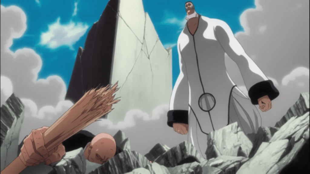 Yumichika fights with Charlotte Chuhlhourne, which might be the only Welsh arrancar we’ve seen so far. Charlotte is a very feminine arrancar who deeply cares about being beautiful and Yumichika is similar in some ways but the two have a very different concept of what beauty is. Unfortunately for Yumichika, he quickly finds himself on the losing end. This is until Charlotte puts them both in a special ability to completely mask them from the outside, which allows Yumichika to use his real Shikai without losing his pride as a member of squad 11. Charlotte doesn’t stand a chance against this power. We switch over to Kira who is fighting against Abirama Redder, a birdlike arrancar who takes great pride in his wings that are heavy as steel. He taunts Kira about Gin betraying them, but Kira is unfazed and instead shows the proud arrancar what squad 3’s modus operandi is by instilling pure terror with his zanpakuto before mercilessly chopping off the arrancar’s head. The third fighter we jump to is Hisagi, who is fighting Findorr Callius. The latter can control his power level based on how much of his mask he breaks off. Hisagi then tells us his thoughts on fighting and how he thinks you should be scared of the tools you use for murder. He releases his shikai and easily overpowers his opponent. Unfortunately right around this time the fourth tower falls, meaning the remaining seated officer, Ikkaku, has lost their fight.