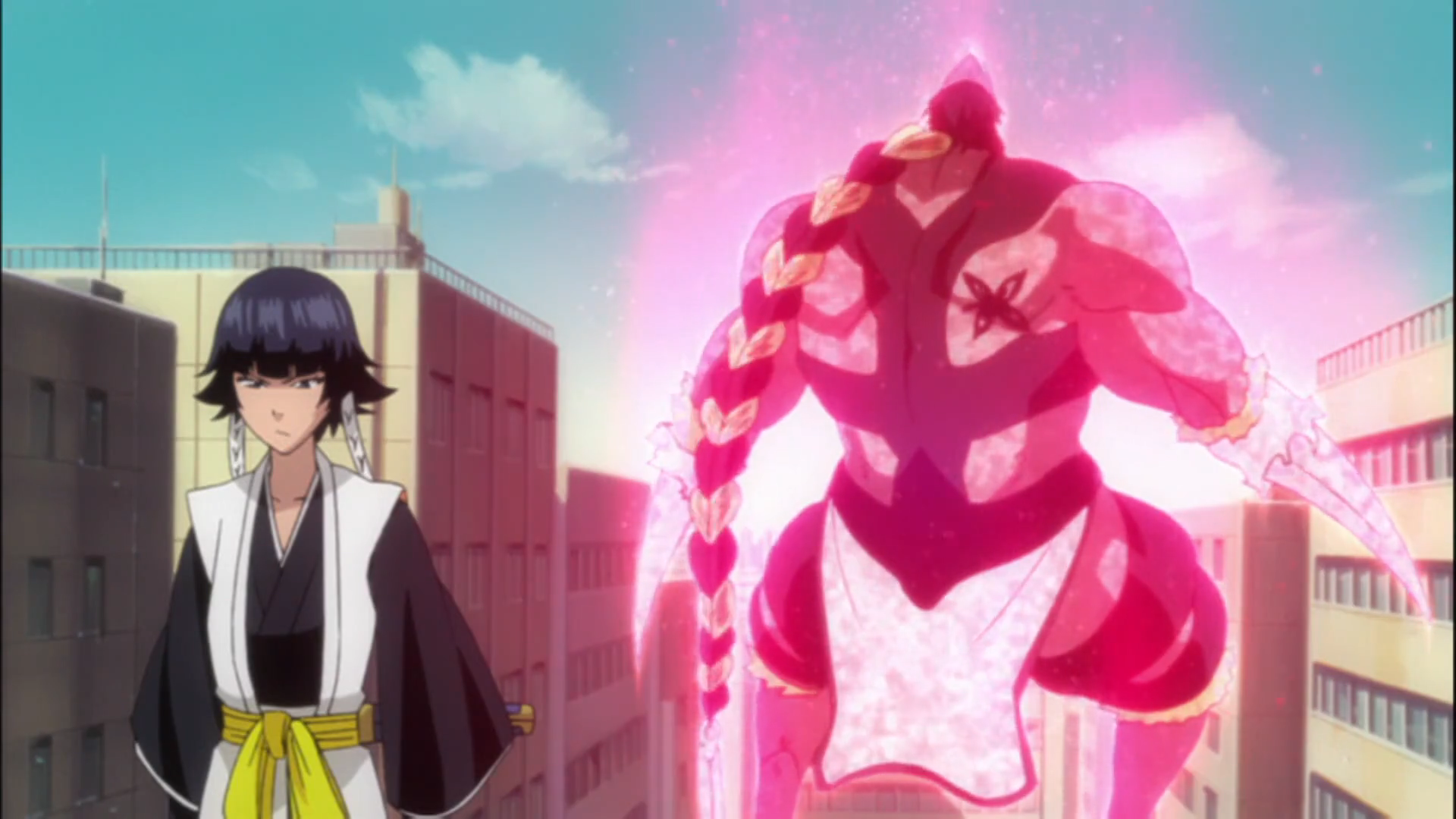 To be a little bit more specific; Karakura’s replacement by a fake town is dependent on a set of pillars on the edge of town. Anything that’s within these pillars will stay in Soul Society, but if someone destroys the pillars, well, that might be bad. Aizen, Tosen and Ichimaru are locked up in a fiery attack by the Captain Commander himself and although I’m confident they could just break through it if they wanted to, they choose to wait it out. I think Aizen’s hubris is his biggest flaw, but if he doesn’t stay back during the rest of the fights it also wouldn’t make for as interesting of a story, so from a storytelling perspective it makes sense for him to wait and see. Meanwhile each of the four towers is attacked by a hollow and there is a quick moment where we’re left to wonder what is going to happen before it’s revealed that, of course, they wouldn’t leave such a crucial part of their plan unguarded. Four of the strongest lieutenants and seated officers that aren’t present at the main congregation were already stationed at the four towers. Yumichika and Ikakku from squad 11, Kira from squad 3 and Hisagi from squad 9. It has at this point been revealed, by the way, that Hisagi’s 69 tattoo is in honor of Kensei, who became a Visored 101 years ago. Nice.
