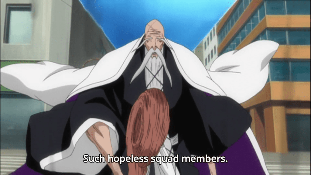 With the tower damaged, the area that’s moved to Soul Society is slowly returning. Luckily Komamura and Iba show up to save the day with specialized tools that were prepared in case one of the towers would fall. Komamura faces the fraccion that defeated Ikkaku and easily wins the fight here. Now Barragan sends his remaining two fracciones to fight with Soi Fon and Omaeda. Both of them hide their strength against the fairly strong arrancar but once they need to finish the fight they easily dispatch their foes. Matsumoto Rangiku has to fight against all three of Halibel’s Fracciones. The three of them easily keep her down and eventually Momo shows up to support her. Everyone is anxious for her to be on the battlefield but she is pretty strong and forces the three arrancar to use their trump card. Their trump card happens to be a super powerful beast they can summon called Ayon. Ayon almost kills Rangiku and heavily damages Momo. When Kira and Hisagi show up to help they also get hurt badly. When things look dire for our lieutenants Ayon suddenly gets heavily damaged. It turns out the Captain Commander is here to dish out some violence as well. He dispatches Ayon and the three arrancar pretty easily but they do seem to get away with their lives.