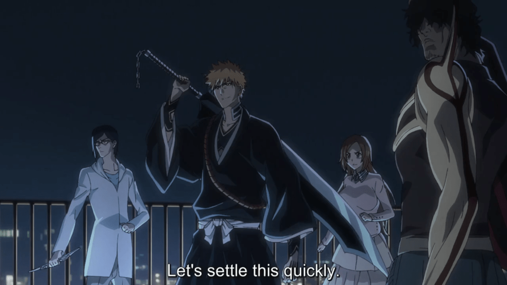 There’s more to that quote, but we’ll get to that later. Kurotsuchi has immediately figured out who’s responsible for the vanishing of Hollows. We’ve heard talk about this way back in the day as well. Soul Reapers purify hollows but Quincy erase them completely. We move to two completely unfamiliar Soul Reapers in Karakura town about to deal with some of the Hollow problems. They’re here to make it so Ichigo doesn’t have to solve everything on hits own. Holy cow, Karakura town looks different. It looks way more modern and eerie in a way. Old Karakura town looked colorful and had an almost rural aesthetic to it for a town that size. I know animation and art direction has come a long way since Bleach first started airing 20 years ago, but the Hollow we see right at the start reminds me more of a Ghoul from Tokyo Ghoul and less of a Hollow. Our new Soul Reaper is on his way to find his friend, but it’s not looking great for either of them right from the get go. Why did Soul Society send two rookies to deal with what is clearly an advanced problem. Have they learned nothing in the time we were away? Incompetents until the end. Luckily, the gang’s all here to solve the problem. Orihime, Sado, Ishida and Ichigo walk into one of the most nostalgic soundtracks I can imagine.