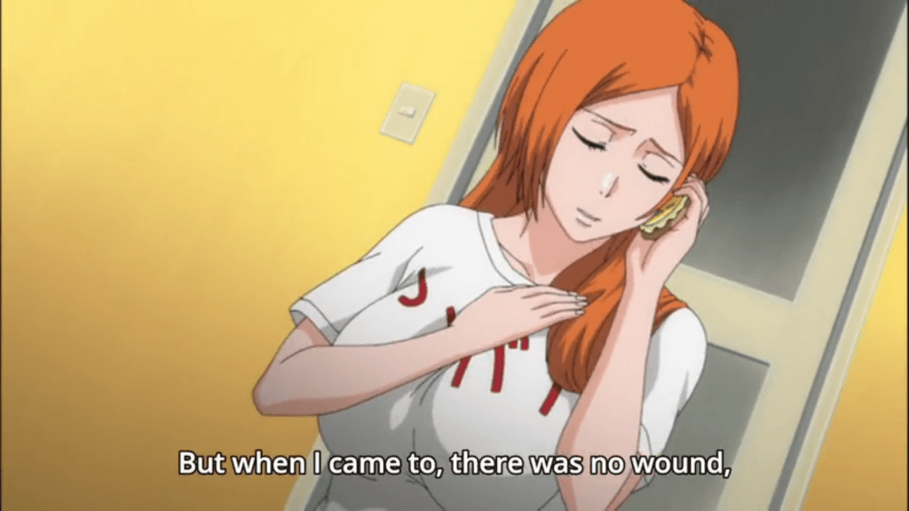 So Ginjo was the one who stabbed Ishida, which is why he was bleeding in the hospital. Him and Tsukishima were working together from the start. Tsukishima cut Ginjo and the other fullbringers as well. Turns out they were all his enemies from the very start. So basically they found the hero who saved the entire world and had gone back to being a normal human. Got him back into the fight and hurt all of his friends only to kill him and take his newfound powers. It’s hard to believe an entire group of people is so awful. When Ichigo is at his lowest he gets stabbed from behind by a very familiar sword. Ichigo is way too far gone to realize what is going on. It makes sense, it’s been seventeen months since he’s last seen Rukia. Seeing Rukia again is such a breath of fresh air. It really reminds me how much I do not care for these Fullbringers. Give me back my fun Soul Reapers and Visoreds, thank you very much. Also, I said it’s a familiar sword that Rukia used, but it’s not, it’s a newly made sword by Urahara. It does kind of look like Sode no Shirayuki though.