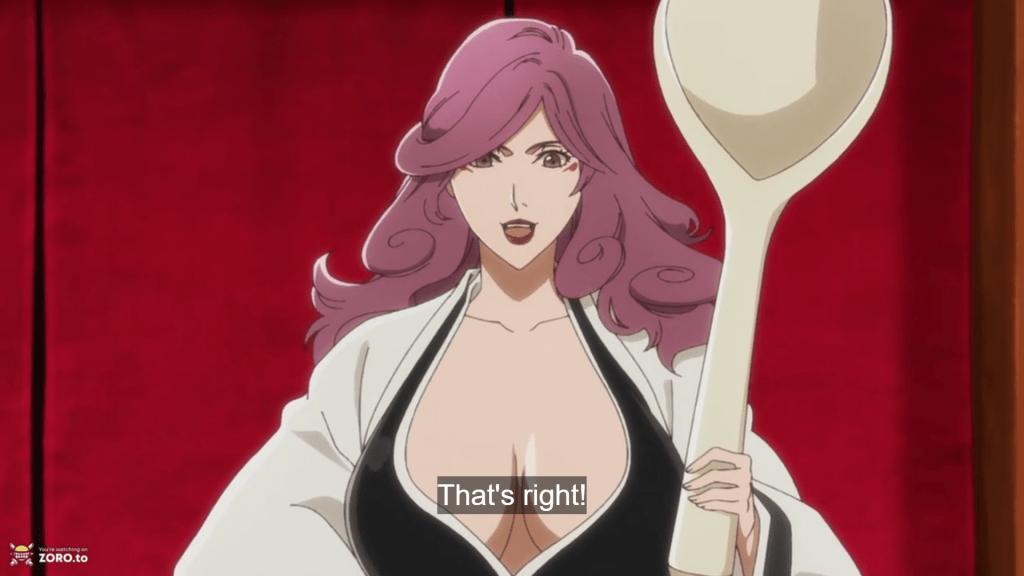 We’re starting off strong. Kyoraku has been named the next Captain Commander after Yamamoto’s passing. Unsurprisingly, he’s not happy about this. He has a meeting with Central 46 who are still as useless and annoying as ever. I wonder if they’re modeled after the US Senate. His plan is to make Zaraki Kenpachi learn Zanjutsu, basically making him unreasonably powerful. And he’s picked someone to do this for him. Captain Unohana from squad four; The first Kenpachi. This reveal was crazy.