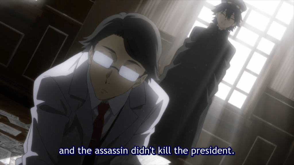 Fukuzawa is quickly starting to realize that Ranpo isn’t just some wisecracking kid, he’s just genuinely super smart. Not only that, he somehow thinks that other people grasp the same concepts. Also, weirdly enough the flashbacks to earlier in the episode are in color. Since we’re following along with Fukuzawa, maybe this is to signify that Fukuzawa isn’t seeing the full picture, hence the lack of color. When he thinks back on things with more information given to him by Ranpo, the full picture starts to form and we see color. Maybe those literature classes weren’t wasted after all? Who am I kidding, they definitely were. Moving on.