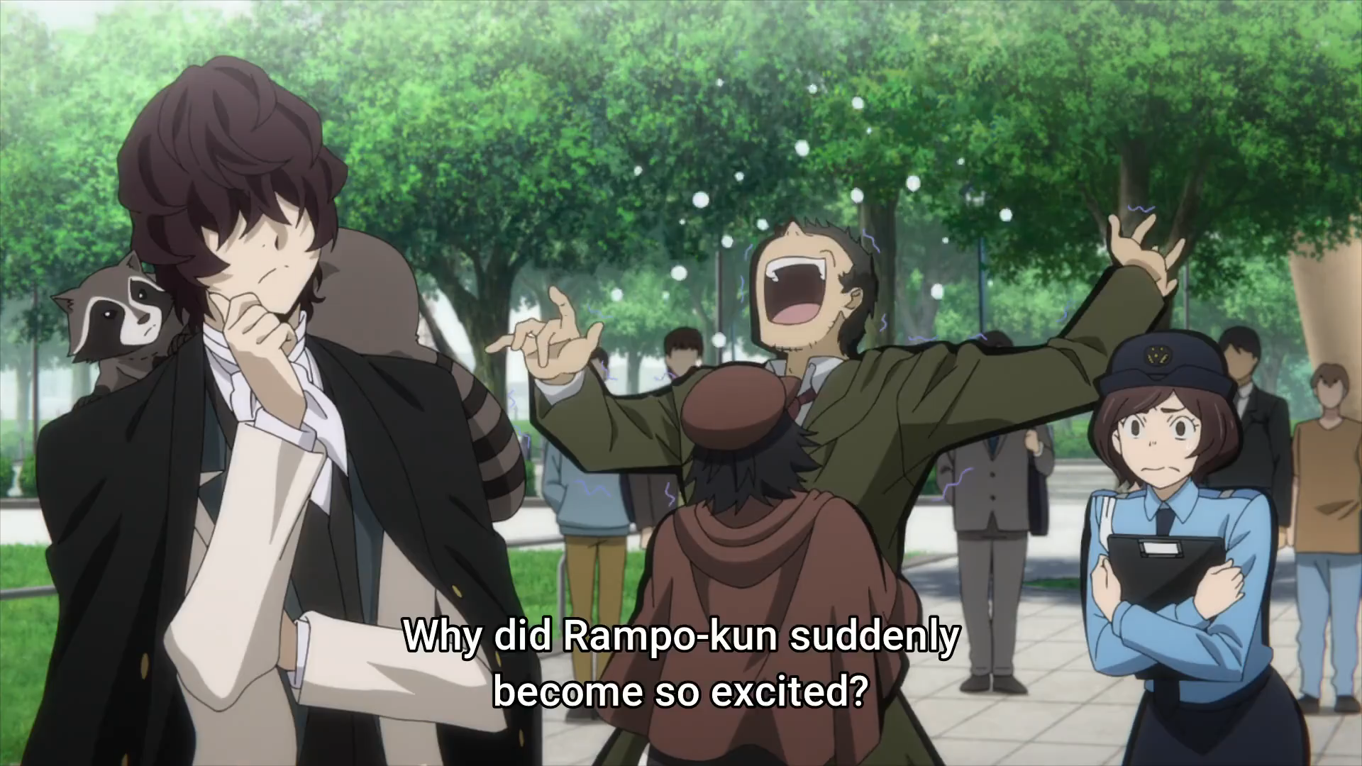 I was about to ask why Kunikida is in jail but the show was good enough to remind me what happened. I remember what happened but I didn’t remember that the death of the young girl had made Kunikida a suspect. Ranpo agrees that he shouldn’t have been in jail. I was hesitant to mention the name Fyodor earlier on in this post, but that is the hat guy from last episode. Presumably he is one of the members of Five. After not breaking out Kunikida, Ranpo goes on to bully Poe. I’m kind of debating rewatching the early seasons since there’s a lot of depth to this show but I think I remember the most important things.