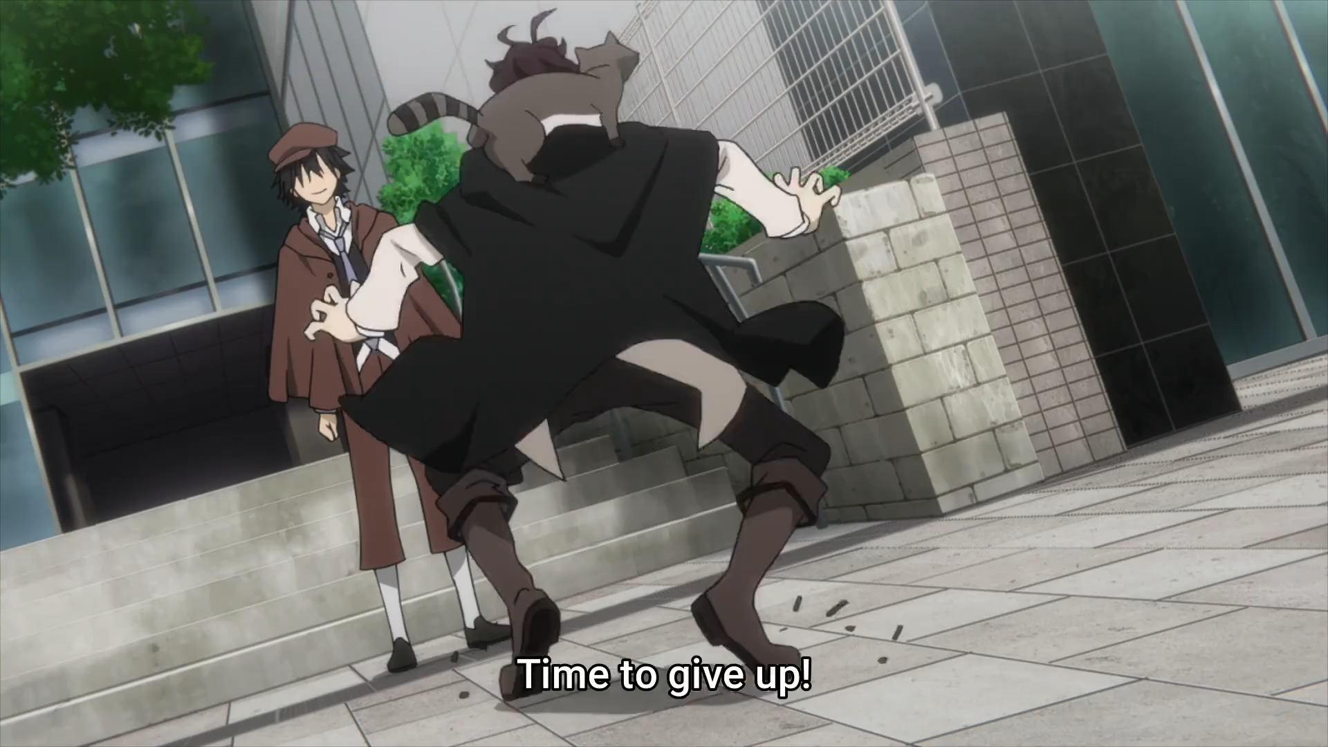 Fukuzawa has left his murderous past behind. We don’t know much about this, but what we do know is that he met Ranpo at some point early on. The two solved a mystery together that involved the organization called V, or Five, as a guy on a nearby rooftop explained. He had a nice hat, remember hat guy from last week? I think I need sleep. Either way, we jump back to the present time after finishing this arc and as I expected, the opening visuals reflect that. No more gray tones of Ranpo and Fukuzawa, but instead the full color of the cast we’ve come to know and love. I’m excited! The song is also definitely growing on me. Music does that a lot, I rarely like a song the first time I listen to it. We see five guys standing in the background over some abstract landscape. I’m putting an early bet on the fact that they’re five. Some of them even have hats, so that checks out.