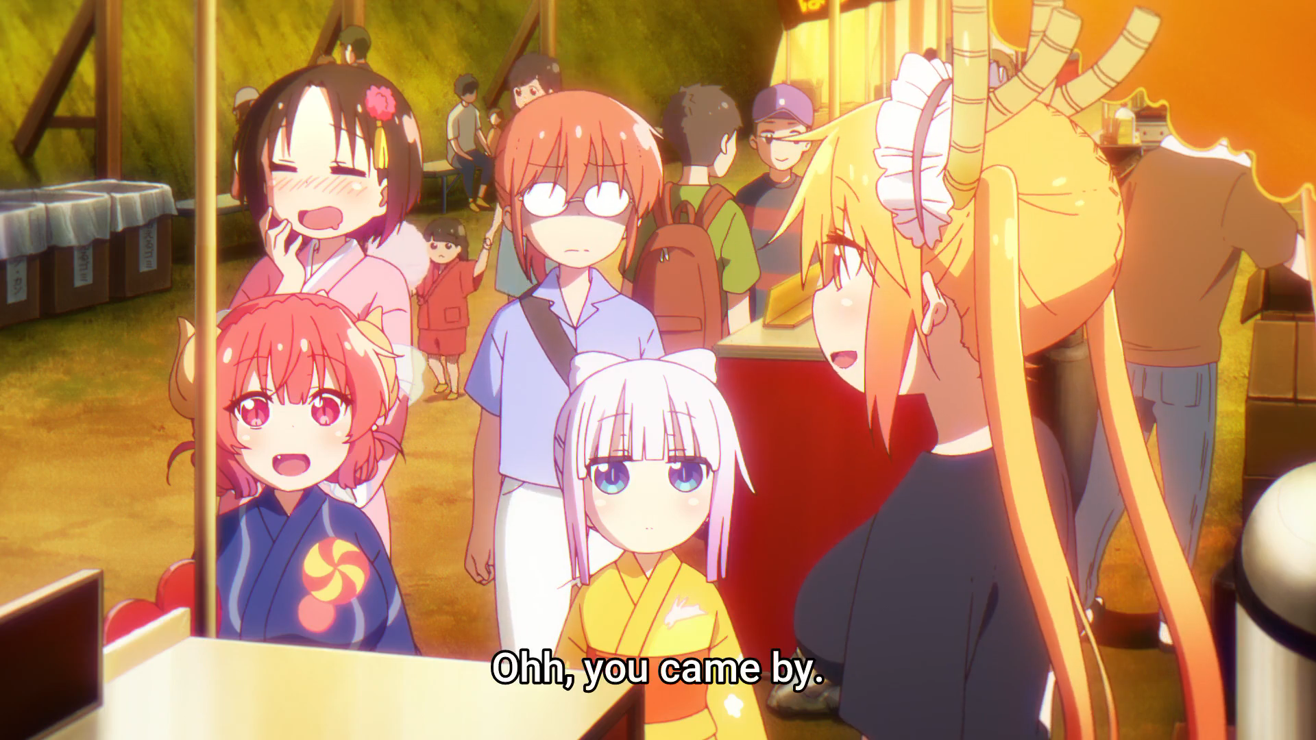 After their clash ends, things go back to normal and we have only three episodes left of this season. That brings me to episode 12 titled: Life is Constant Change (But It’s Okay To Stop And Appreciate It). This episode features a summer festival and the cast is attending. Summer festivals in anime always look like such fun, which makes me all the more sad that I had so much anxiety growing up. I remember my parents taking me to similar events on holiday and I would just be crying and wanting to go home. Missed opportunities. The episode starts off filled with melancholy. Both Tohru and Kobayashi think back to how they met and in Tohru’s case what got her to this world. The episode slowly meanders through the day of the festival until we reach the main event. It’s also interesting to hear the dragons talk about the festivals from their old world. They’re both different and similar. Everyone splits off into their own little groups and enjoys the festival separately. They’re sitting on a bench eating festival food while talking about being ancient gods and dragons. It’s the stark contrast between the two that makes this show so interesting.