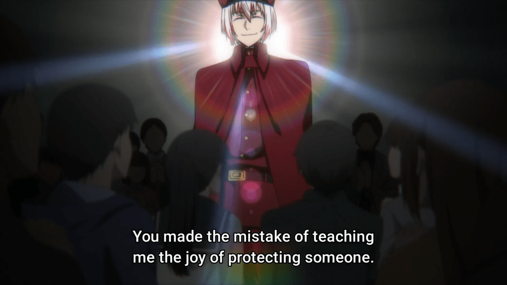 Ranpo reveals that although the vampiric scourge is doing the rounds, if the Europeans were to fight back, the problem would eventually be solved. There is more to this plan though as their goal seems to be putting their hands on an artifact called The One Order. This supposedly causes soldiers to follow orders, it’s mind control. I like the conversation they had about how many bullets it takes to kill a soldier on the battlefield. I have my doubts about the accuracy of the numbers, but some mild googling didn’t help much. I just saw people get scolded for asking insensitive questions. You’re right, we should start banning knowledge and perhaps even burn it, that won’t end poorly at all. Depressing real world opinions aside, it makes sense to me that many soldiers would shoot at random spots to avoid becoming murderers. I’m sure there’s arguments to be made that fighting a war can be needed (if you’re the defending party, or when they pushed back the nazi’s in world war II, but I can also imagine there are many soldiers fighting in wars that don’t want to hurt people, they’re there to protect. It’s complicated, and I like to think there’s good people in every place. As Ranpo points out though, this is an artifact that can backfire pretty quickly. He also points out how cliche and lame the Decay of Angels’ true goal is (I don’t mind some self-awareness from an author). World Domination sounds awfully exhausting. As much as I like to think I’d be able to make the world a better place, I am not smart enough to actually do so. I think anyone who truly believes they could be the one ruler of mankind and make a good and just world is thinking too highly of themselves and that’s dangerous.